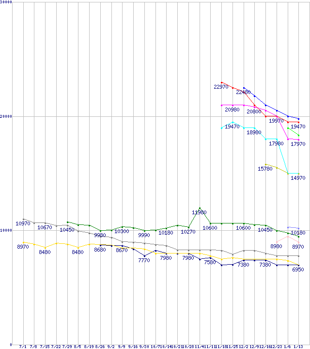 HDD 2TB以上の最安値推移↑前グラフ↓次グラフ(2010年7月1日〜2011年1月13日)※このグラフは過去のデータも税率5%相当に調整した税込み相当額のグラフです。凡例WD30EZRSDTL (3TB,64MB,SATAカード付属)WD30EZRS (3TB,64MB)0S03088(純正パッケージ品) (3TB,64MB)HDS723030ALA640 (3TB,64MB)WD25EZRS (2.5TB,64MB)WD2002FAEX (2TB,64MB)0S03191(純正パッケージ品) (2TB,64MB)HDS723020BLA642 (2TB,64MB)0S02602(純正パッケージ品) (2TB,32MB)HDS5C3020ALA632 (2TB,32MB)ST32000542AS (2TB,32MB)WD20EARS (2TB,64MB)HD204UI (2TB,32MB)※製品名をクリックすると個別のグラフを表示します※点線部は販売店が確認できなかった、または調査データがないことを示します