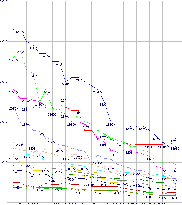 メモリ主要製品の最安値推移↑前グラフ↓次グラフ(2010年7月3日〜2011年1月15日)※このグラフは過去のデータも税率5%相当に調整した税込み相当額のグラフです。凡例PC3-12800 4GB×3枚組みセットPC2-6400 4GB×2枚組みセットPC3-10600 4GB×3枚組みセットPC3-12800 4GB×2枚組みセットPC2-6400 4GBPC3-12800 4GBPC3-10600 4GB×2枚組みセットPC3-10600 2GB×3枚組みセットPC2-6400 2GB×2枚組みセットPC3-12800 2GB×3枚組みセットPC3-12800 2GB×2枚組みセットPC3-10600 4GBPC3-10600 2GB×2枚組みセットPC3-12800 2GBPC2-6400 2GBPC3-10600 2GB※製品名をクリックすると個別のグラフを表示します※点線部は販売店が確認できなかった、または調査データがないことを示します