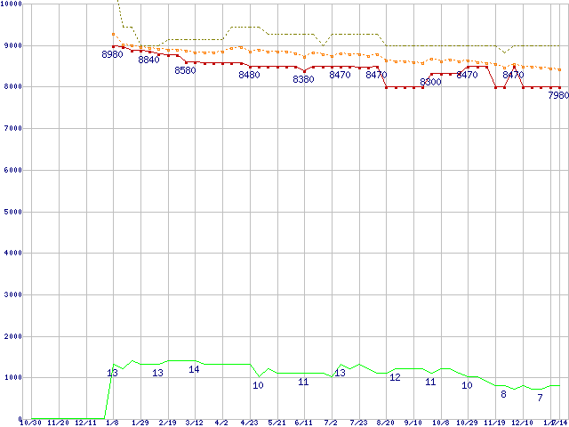 Pentium G6950 (2.8GHz)の価格推移↑前グラフ↓次グラフ(2009年10月30日〜2011年1月14日)※このグラフは過去のデータも税率5%相当に調整した税込み相当額のグラフです。●関連グラフCPU主要製品の最安値推移CPU主要製品(最安値1万円未満)の最安値推移Intel系CPUの最安値推移LGA1156 (L3キャッシュ3MB,Dual Core,GPU内蔵,TDP 73W)の最安値推移●凡例最安値(点線部は販売店未確認または未調査)平均値最高値ショップ数