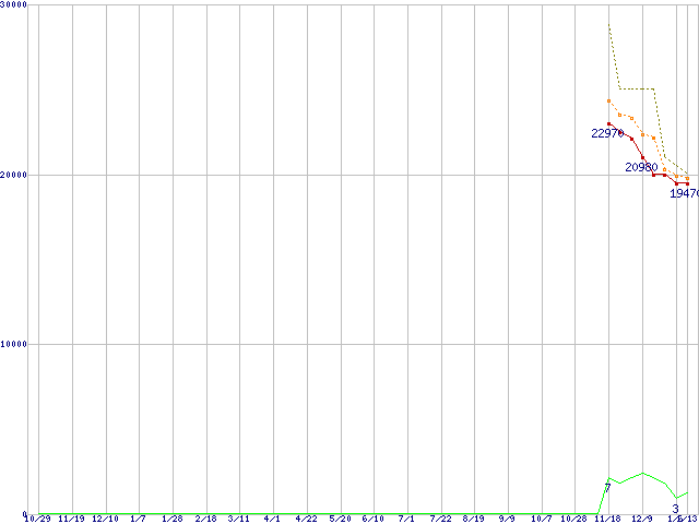 WD30EZRS (3TB,64MB)の価格推移↑前グラフ↓次グラフ(2009年10月29日〜2011年1月13日)※このグラフは過去のデータも税率5%相当に調整した税込み相当額のグラフです。●関連グラフHDD/SSD主要製品の最安値推移HDD/SSD主要製品(最安値1万5千円〜2万円未満)の最安値推移HDD 2TB以上の最安値推移WD Caviar Green (3Gb/s)の最安値推移●凡例最安値(点線部は販売店未確認または未調査)平均値最高値ショップ数