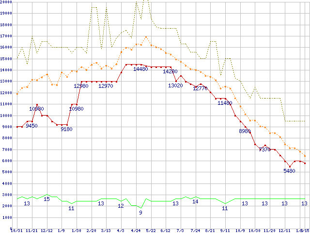 PC3-10600 2GB×3枚組みセットの価格推移↑前グラフ↓次グラフ(2009年10月31日〜2011年1月15日)※このグラフは過去のデータも税率5%相当に調整した税込み相当額のグラフです。●関連グラフメモリ主要製品の最安値推移メモリ主要製品(最安値5千円〜1万円未満)の最安値推移PC3-10600(DDR3-1333) DDR3 SDRAM DIMMの最安値推移●凡例最安値(点線部は販売店未確認または未調査)平均値最高値ショップ数