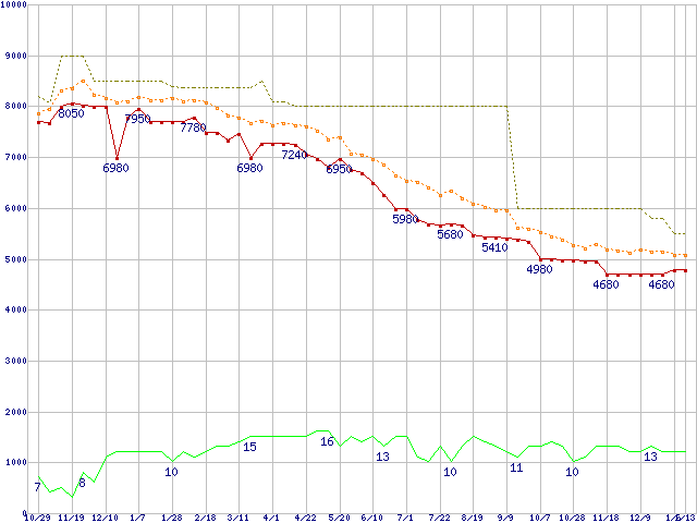 ST31000528AS (1TB,32MB)の価格推移↑前グラフ↓次グラフ(2009年10月29日〜2011年1月13日)※このグラフは過去のデータも税率5%相当に調整した税込み相当額のグラフです。●関連グラフHDD/SSD主要製品の最安値推移HDD/SSD主要製品(最安値1万円未満)の最安値推移HDD 1TB〜1.5TB未満の最安値推移Barracuda 7200.12 (7200rpm,3Gb/s)の最安値推移●凡例最安値(点線部は販売店未確認または未調査)平均値最高値ショップ数