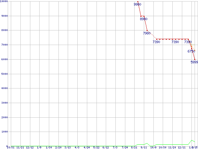 PC3-12800 4GBの価格推移↑前グラフ↓次グラフ(2009年10月31日〜2011年1月15日)※このグラフは過去のデータも税率5%相当に調整した税込み相当額のグラフです。●関連グラフメモリ主要製品の最安値推移4GBモジュール/2GBモジュール×2枚の最安値推移メモリ主要製品(最安値5千円〜1万円未満)の最安値推移PC3-12800(DDR3-1600) DDR3 SDRAM DIMMの最安値推移●凡例最安値(点線部は販売店未確認または未調査)平均値最高値ショップ数