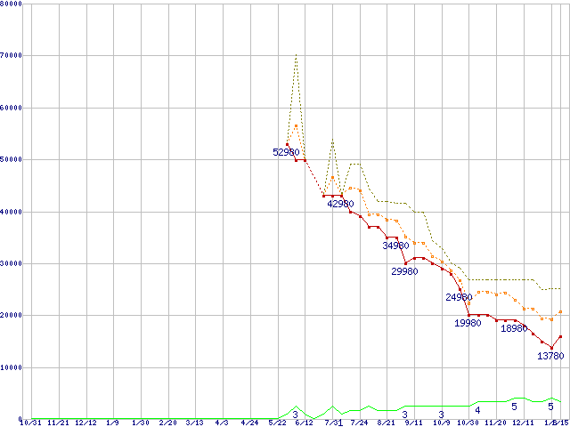 PC3-12800 4GB×3枚組みセットの価格推移↑前グラフ↓次グラフ(2009年10月31日〜2011年1月15日)※このグラフは過去のデータも税率5%相当に調整した税込み相当額のグラフです。●関連グラフメモリ主要製品の最安値推移メモリ主要製品(最安値1万円以上)の最安値推移PC3-12800(DDR3-1600) DDR3 SDRAM DIMMの最安値推移●凡例最安値(点線部は販売店未確認または未調査)平均値最高値ショップ数