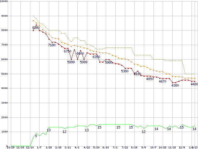 WD10EARS (1TB,64MB)の価格推移↑前グラフ↓次グラフ(2009年10月29日〜2011年1月13日)※このグラフは過去のデータも税率5%相当に調整した税込み相当額のグラフです。●関連グラフHDD/SSD主要製品の最安値推移HDD/SSD主要製品(最安値1万円未満)の最安値推移HDD 1TB〜1.5TB未満の最安値推移WD Caviar Green (3Gb/s)の最安値推移●凡例最安値(点線部は販売店未確認または未調査)平均値最高値ショップ数