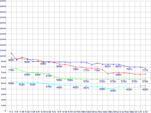 | WD Scorpio Blue (5200〜5400rpm,3Gb/s,2.5インチ)の最安値推移 |