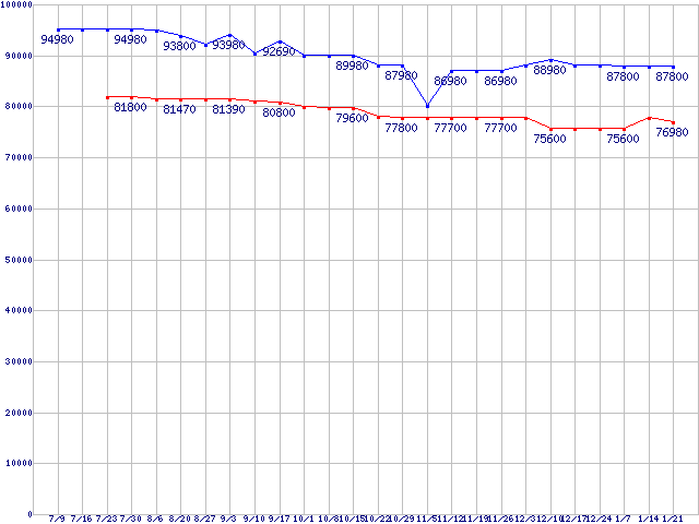 | CPU主要製品(最安値6万円以上)の最安値推移 |