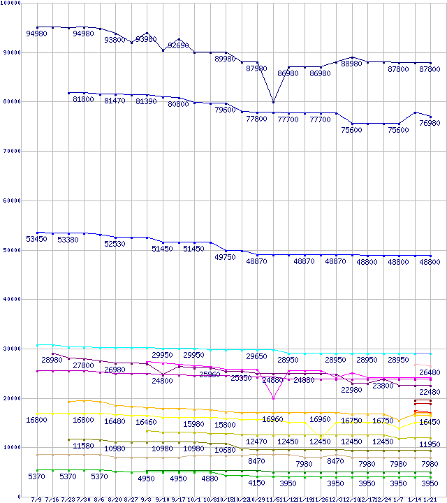 Intel系CPUの最安値推移↑前グラフ↓次グラフ(2010年7月9日〜2011年1月21日)※このグラフは過去のデータも税率5%相当に調整した税込み相当額のグラフです。凡例Core i7-980X Extreme Edition (3.33GHz)Core i7-970 (3.2GHz)Core i7-960 (3.20GHz)Core i7-2600K (3.40GHz)Core 2 Quad Q9650 (3.00GHz,L2 6MB×2)Core i7-2600 (3.40GHz)Core i7-950 (3.06GHz)Core 2 Quad Q9550 (2.83GHz,L2 6MB×2)Core i7-870 (2.93GHz)Core i5-2500K (3.30GHz,TDP 95W)Core i5-2500 (3.30GHz,TDP 95W)Core i5-2400S (2.50GHz,TDP 65W)Core i5-2400 (3.10GHz,TDP 95W)Core i5-760 (2.8GHz)Core i5-2300 (2.80GHz,TDP 95W)Core i5-650 (3.2GHz)Core i3-560 (3.33GHz)Core i3-540 (3.06GHz)Pentium G6950 (2.8GHz)Celeron E3500 (2.7GHz)Celeron E3400 (2.6GHz)※製品名をクリックすると個別のグラフを表示します※点線部は販売店が確認できなかった、または調査データがないことを示します
