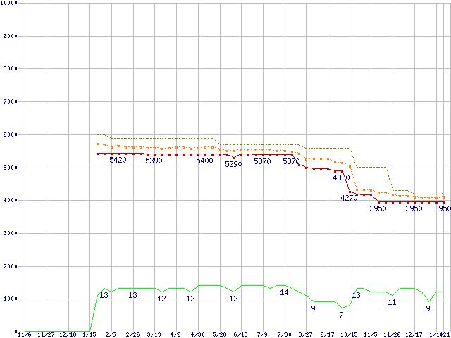 Celeron E3400 (2.6GHz)の価格推移↑前グラフ↓次グラフ(2009年11月6日〜2011年1月21日)※このグラフは過去のデータも税率5%相当に調整した税込み相当額のグラフです。●関連グラフCPU主要製品の最安値推移CPU主要製品(最安値1万円未満)の最安値推移Intel系CPUの最安値推移LGA775 (FSB 800MHz,L2 1MB,Dual Core,TDP 65W)の最安値推移●凡例最安値(点線部は販売店未確認または未調査)平均値最高値ショップ数