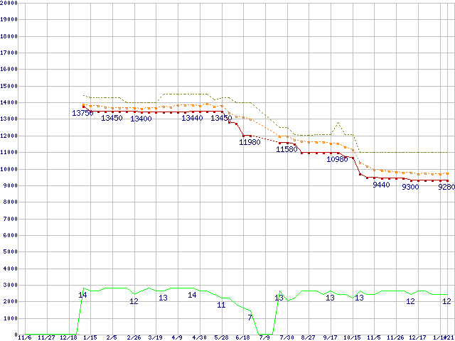 Core i3-540 (3.06GHz)の価格推移↑前グラフ↓次グラフ(2009年11月6日〜2011年1月21日)※このグラフは過去のデータも税率5%相当に調整した税込み相当額のグラフです。●関連グラフCPU主要製品の最安値推移CPU主要製品(最安値1万円未満)の最安値推移Intel系CPUの最安値推移LGA1156 (L3キャッシュ4MB,Dual Core,GPU内蔵,Hyper-Threading,TDP 73〜87W)の最安値推移●凡例最安値(点線部は販売店未確認または未調査)平均値最高値ショップ数