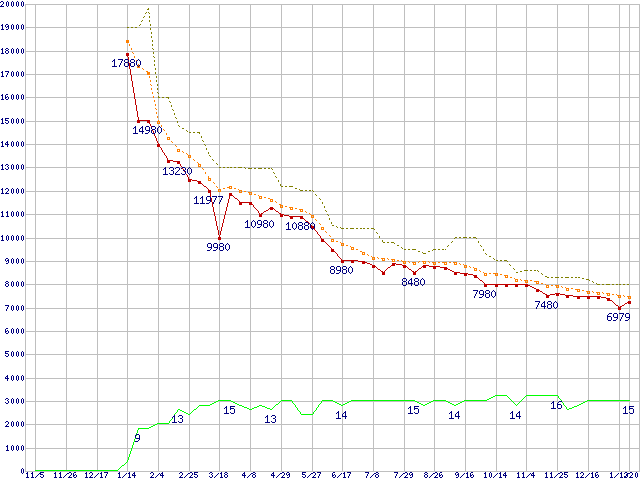 WD20EARS (2TB,64MB)の価格推移↑前グラフ↓次グラフ(2009年11月5日〜2011年1月20日)※このグラフは過去のデータも税率5%相当に調整した税込み相当額のグラフです。●関連グラフHDD/SSD主要製品の最安値推移HDD/SSD主要製品(最安値1万円未満)の最安値推移HDD 2TB以上の最安値推移WD Caviar Green (3Gb/s)の最安値推移●凡例最安値(点線部は販売店未確認または未調査)平均値最高値ショップ数