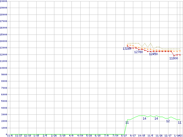 Core i3-560 (3.33GHz)の価格推移↑前グラフ↓次グラフ(2009年11月6日〜2011年1月21日)※このグラフは過去のデータも税率5%相当に調整した税込み相当額のグラフです。●関連グラフCPU主要製品の最安値推移CPU主要製品(最安値1万円〜2万円未満)の最安値推移Intel系CPUの最安値推移LGA1156 (L3キャッシュ4MB,Dual Core,GPU内蔵,Hyper-Threading,TDP 73〜87W)の最安値推移●凡例最安値(点線部は販売店未確認または未調査)平均値最高値ショップ数