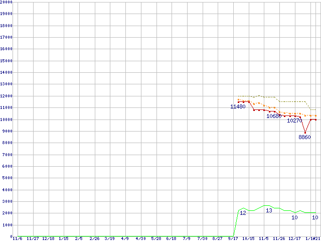 Athlon II X4 645 (3.1GHz,L2 512KB×4,TDP 95W)の価格推移↑前グラフ↓次グラフ(2009年11月6日〜2011年1月21日)※このグラフは過去のデータも税率5%相当に調整した税込み相当額のグラフです。●関連グラフCPU主要製品の最安値推移CPU主要製品(最安値1万円未満)の最安値推移AMD系CPUの最安値推移Socket AM3 (Quad Core)の最安値推移●凡例最安値(点線部は販売店未確認または未調査)平均値最高値ショップ数
