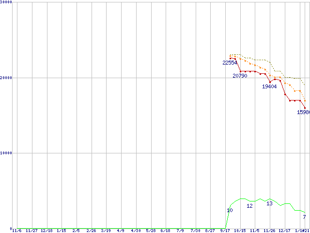 Phenom II X6 1075T (3.0GHz,L2 512KB×6,L3 6MB,TDP 125W)の価格推移↑前グラフ↓次グラフ(2009年11月6日〜2011年1月21日)※このグラフは過去のデータも税率5%相当に調整した税込み相当額のグラフです。●関連グラフCPU主要製品の最安値推移CPU主要製品(最安値1万円〜2万円未満)の最安値推移AMD系CPUの最安値推移Socket AM3 (HyperTransport 3.0,6Core)の最安値推移●凡例最安値(点線部は販売店未確認または未調査)平均値最高値ショップ数