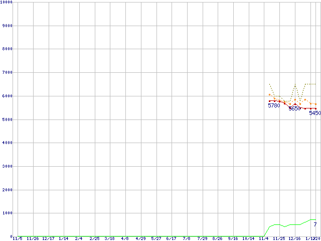 HTS547564A9E384 (640GB,8MB)の価格推移↑前グラフ↓次グラフ(2009年11月5日〜2011年1月20日)※このグラフは過去のデータも税率5%相当に調整した税込み相当額のグラフです。●関連グラフHDD/SSD主要製品の最安値推移HDD/SSD主要製品(最安値1万円未満)の最安値推移HDD 600〜750GB未満の最安値推移Travelstar 5K750 (5400rpm,3Gb/s,2.5インチ)の最安値推移●凡例最安値(点線部は販売店未確認または未調査)平均値最高値ショップ数