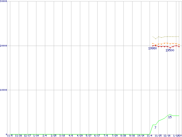 X25-M(G2) (120GB,MLC)の価格推移↑前グラフ↓次グラフ(2009年11月5日〜2011年1月20日)※このグラフは過去のデータも税率5%相当に調整した税込み相当額のグラフです。●関連グラフHDD/SSD主要製品の最安値推移HDD/SSD主要製品(最安値1万5千円〜2万円未満)の最安値推移HDD 100〜160GB未満の最安値推移X25-M Mainstream SATA SSD (SSD,3Gbps,2.5インチ)の最安値推移●凡例最安値(点線部は販売店未確認または未調査)平均値最高値ショップ数