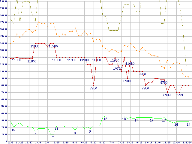 その他2.5インチSSD 64GB (64GB,MLC)の価格推移↑前グラフ↓次グラフ(2009年11月5日〜2011年1月20日)※このグラフは過去のデータも税率5%相当に調整した税込み相当額のグラフです。●関連グラフHDD/SSD主要製品の最安値推移HDD/SSD主要製品(最安値1万円未満)の最安値推移HDD/SSD 60GB〜80GB未満の最安値推移2.5インチSSD (SSD,3Gbps,2.5インチ)の最安値推移●凡例最安値(点線部は販売店未確認または未調査)平均値最高値ショップ数