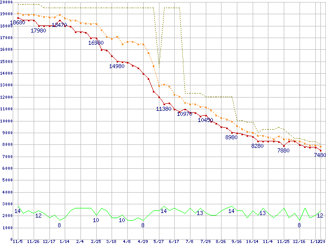 ST32000542AS (2TB,32MB)の価格推移↑前グラフ↓次グラフ(2009年11月5日〜2011年1月20日)※このグラフは過去のデータも税率5%相当に調整した税込み相当額のグラフです。●関連グラフHDD/SSD主要製品の最安値推移HDD/SSD主要製品(最安値1万円未満)の最安値推移HDD 2TB以上の最安値推移Barracuda LP (5900rpm,3Gb/s)の最安値推移●凡例最安値(点線部は販売店未確認または未調査)平均値最高値ショップ数