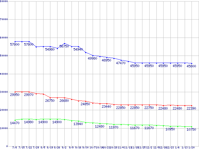 | RealSSD C300 (SSD,6Gbps,2.5インチ,リード355MB/s・ライト215〜70MB/s)の最安値推移 |