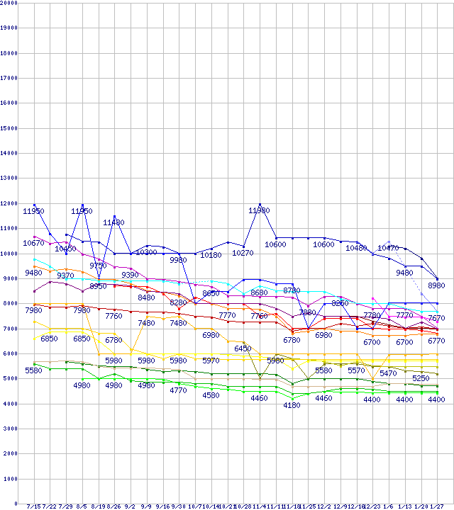 HDD/SSD主要製品(最安値1万円未満)の最安値推移↑前グラフ↓次グラフ(2010年7月15日〜2011年1月27日)※このグラフは過去のデータも税率5%相当に調整した税込み相当額のグラフです。凡例0S03191(純正パッケージ品) (2TB,64MB)0S02602(純正パッケージ品) (2TB,32MB)その他2.5インチSSD 64GB (64GB,MLC)ST2000DL003 (2TB,64MB)WD10TPVT (1TB,8MB,12.5mm厚)HM100UI (1TB,8MB)ST1500DL003 (1.5TB,64MB)ST32000542AS (2TB,32MB)WD20EARS (2TB,64MB)0S03085 (750GB,8MB)WD1002FAEX (1TB,64MB)HD204UI (2TB,32MB)WD7500BPVT (750GB,8MB)その他2.5インチSSD 32GB (32GB,MLC)WD6400BPVT (640GB,8MB)WD15EARS (1.5TB,64MB)HTS547564A9E384 (640GB,8MB)WD10EALX (1TB,32MB)ST31000528AS (1TB,32MB)0S02601(純正パッケージ品) (1TB,32MB)WD10EARS (1TB,64MB)0S02598 (500GB,8MB)※製品名をクリックすると個別のグラフを表示します※点線部は販売店が確認できなかった、または調査データがないことを示します