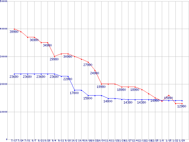 | メモリ主要製品(最安値1万円以上)の最安値推移 |