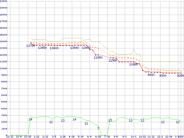 Core i3-540 (3.06GHz)の価格推移↑前グラフ↓次グラフ(2009年11月13日〜2011年1月28日)※このグラフは過去のデータも税率5%相当に調整した税込み相当額のグラフです。●関連グラフCPU主要製品の最安値推移CPU主要製品(最安値1万円未満)の最安値推移Intel系CPUの最安値推移LGA1156 (L3キャッシュ4MB,Dual Core,GPU内蔵,Hyper-Threading,TDP 73〜87W)の最安値推移●凡例最安値(点線部は販売店未確認または未調査)平均値最高値ショップ数