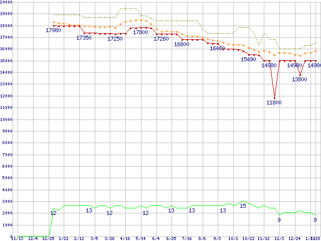 Core i5-650 (3.2GHz)の価格推移↑前グラフ↓次グラフ(2009年11月13日〜2011年1月28日)※このグラフは過去のデータも税率5%相当に調整した税込み相当額のグラフです。●関連グラフCPU主要製品の最安値推移CPU主要製品(最安値1万円〜2万円未満)の最安値推移Intel系CPUの最安値推移LGA1156 (L3キャッシュ4MB,Dual Core,GPU内蔵,Hyper-Threading,TDP 73〜87W)の最安値推移●凡例最安値(点線部は販売店未確認または未調査)平均値最高値ショップ数