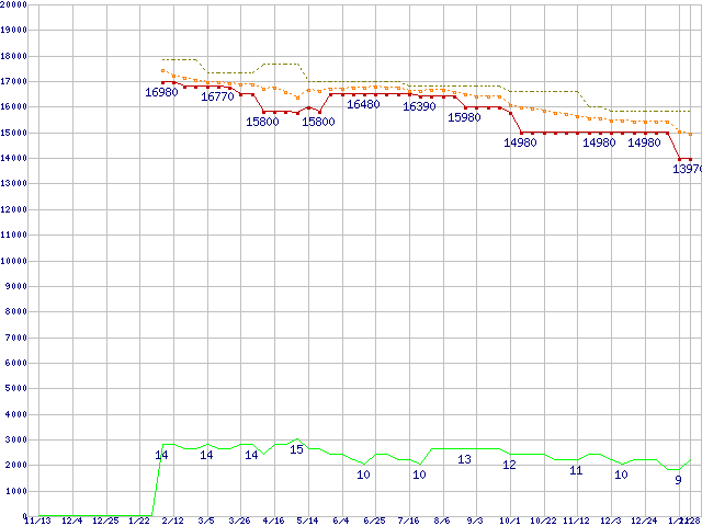 Phenom II X4 910e (2.6GHz,L2 512KB×4,L3 6MB,TDP 65W)の価格推移↑前グラフ↓次グラフ(2009年11月13日〜2011年1月28日)※このグラフは過去のデータも税率5%相当に調整した税込み相当額のグラフです。●関連グラフCPU主要製品の最安値推移CPU主要製品(最安値1万円〜2万円未満)の最安値推移AMD系CPUの最安値推移Socket AM3 (HyperTransport 3.0,Quad Core)の最安値推移●凡例最安値(点線部は販売店未確認または未調査)平均値最高値ショップ数