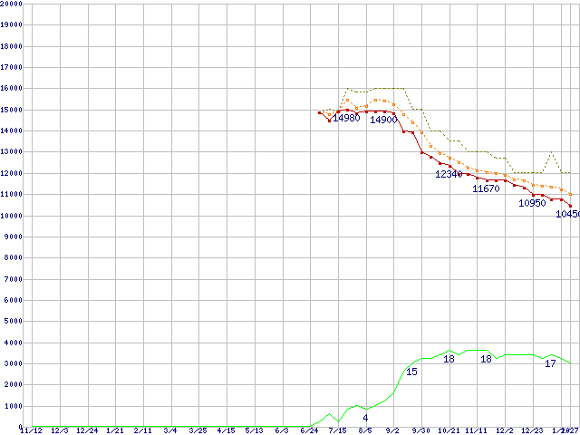 CTFDDAC064MAG-1G1 (64GB,MLC)の価格推移↑前グラフ↓次グラフ(2009年11月12日〜2011年1月27日)※このグラフは過去のデータも税率5%相当に調整した税込み相当額のグラフです。●関連グラフHDD/SSD主要製品の最安値推移HDD/SSD主要製品(最安値1万円〜1万5千円未満)の最安値推移HDD/SSD 60GB〜80GB未満の最安値推移RealSSD C300 (SSD,6Gbps,2.5インチ,リード355MB/s・ライト215〜70MB/s)の最安値推移●凡例最安値(点線部は販売店未確認または未調査)平均値最高値ショップ数