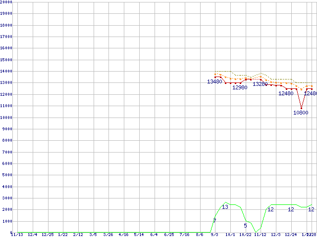 Phenom II X4 955 (3.2GHz,L2 512KB×4,L3 6MB,TDP 95W)の価格推移↑前グラフ↓次グラフ(2009年11月13日〜2011年1月28日)※このグラフは過去のデータも税率5%相当に調整した税込み相当額のグラフです。●関連グラフCPU主要製品の最安値推移CPU主要製品(最安値1万円〜2万円未満)の最安値推移AMD系CPUの最安値推移Socket AM3 (HyperTransport 3.0,Quad Core)の最安値推移●凡例最安値(点線部は販売店未確認または未調査)平均値最高値ショップ数
