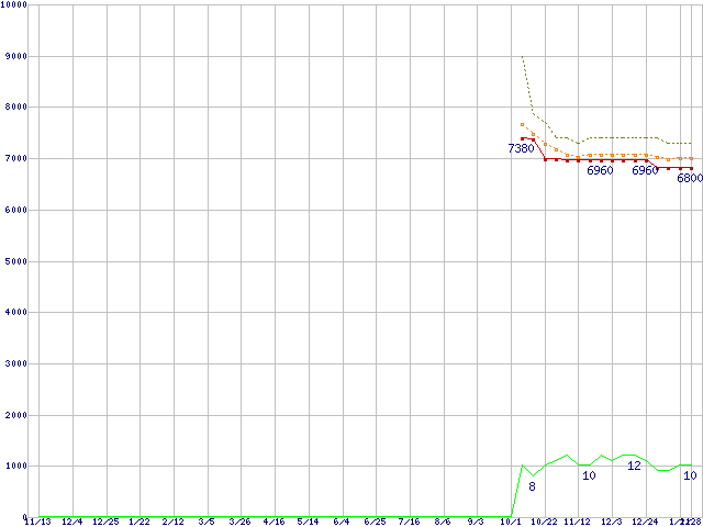 Athlon II X2 250e (3.0GHz,L2 1MB×2,TDP 45W)の価格推移↓次グラフ(2009年11月13日〜2011年1月28日)※このグラフは過去のデータも税率5%相当に調整した税込み相当額のグラフです。●関連グラフCPU主要製品の最安値推移CPU主要製品(最安値1万円未満)の最安値推移AMD系CPUの最安値推移Socket AM3 (Dual Core)の最安値推移●凡例最安値(点線部は販売店未確認または未調査)平均値最高値ショップ数