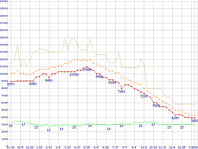 PC3-12800 2GB×2枚組みセットの価格推移↑前グラフ↓次グラフ(2009年11月14日〜2011年1月29日)※このグラフは過去のデータも税率5%相当に調整した税込み相当額のグラフです。●関連グラフメモリ主要製品の最安値推移4GBモジュール/2GBモジュール×2枚の最安値推移メモリ主要製品(最安値5千円未満)の最安値推移PC3-12800(DDR3-1600) DDR3 SDRAM DIMMの最安値推移●凡例最安値(点線部は販売店未確認または未調査)平均値最高値ショップ数