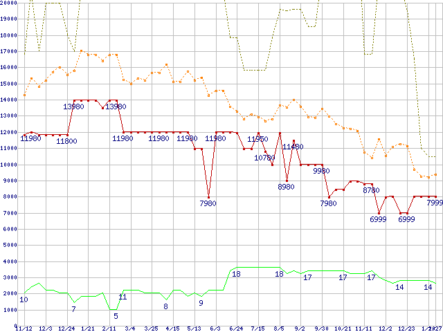 その他2.5インチSSD 64GB (64GB,MLC)の価格推移↑前グラフ↓次グラフ(2009年11月12日〜2011年1月27日)※このグラフは過去のデータも税率5%相当に調整した税込み相当額のグラフです。●関連グラフHDD/SSD主要製品の最安値推移HDD/SSD主要製品(最安値1万円未満)の最安値推移HDD/SSD 60GB〜80GB未満の最安値推移2.5インチSSD (SSD,3Gbps,2.5インチ)の最安値推移●凡例最安値(点線部は販売店未確認または未調査)平均値最高値ショップ数