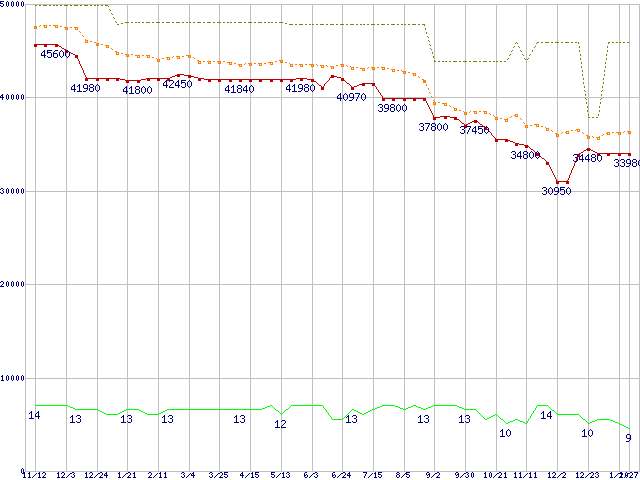 X25-M(G2) (160GB,MLC)の価格推移↑前グラフ↓次グラフ(2009年11月12日〜2011年1月27日)※このグラフは過去のデータも税率5%相当に調整した税込み相当額のグラフです。●関連グラフHDD/SSD主要製品の最安値推移HDD/SSD主要製品(最安値2万円以上)の最安値推移HDD 160〜200GB未満の最安値推移X25-M Mainstream SATA SSD (SSD,3Gbps,2.5インチ)の最安値推移●凡例最安値(点線部は販売店未確認または未調査)平均値最高値ショップ数