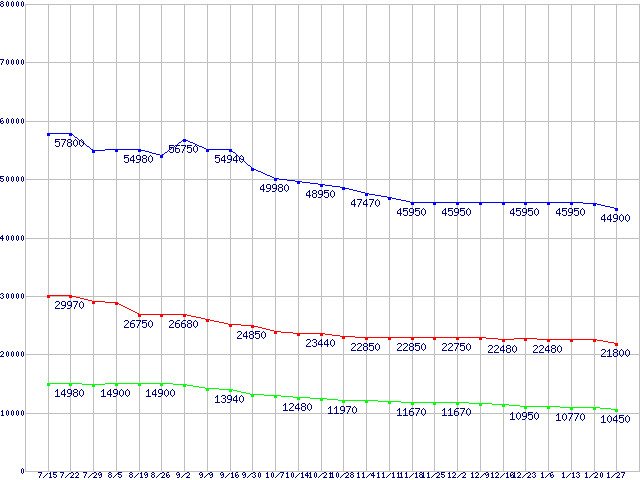 | RealSSD C300 (SSD,6Gbps,2.5インチ,リード355MB/s・ライト215〜70MB/s)の最安値推移 |