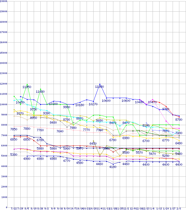 HDD/SSD主要製品(最安値1万円未満)の最安値推移↑前グラフ↓次グラフ(2010年7月22日〜2011年2月3日)※このグラフは過去のデータも税率5%相当に調整した税込み相当額のグラフです。凡例0S02602(純正パッケージ品) (2TB,32MB)0S03191(純正パッケージ品) (2TB,64MB)その他2.5インチSSD 64GB (64GB,MLC)ST2000DL003 (2TB,64MB)ST32000542AS (2TB,32MB)WD10TPVT (1TB,8MB,12.5mm厚)ST1500DL003 (1.5TB,64MB)WD20EARS (2TB,64MB)0S03085 (750GB,8MB)WD1002FAEX (1TB,64MB)HD204UI (2TB,32MB)WD7500BPVT (750GB,8MB)WD6400BPVT (640GB,8MB)WD15EARS (1.5TB,64MB)HTS547564A9E384 (640GB,8MB)WD10EALX (1TB,32MB)0S02601(純正パッケージ品) (1TB,32MB)ST31000528AS (1TB,32MB)WD10EARS (1TB,64MB)0S02598 (500GB,8MB)※製品名をクリックすると個別のグラフを表示します※点線部は販売店が確認できなかった、または調査データがないことを示します