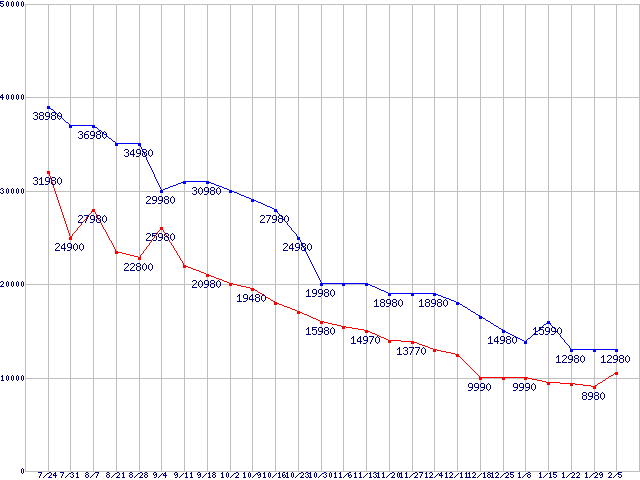 | メモリ主要製品(最安値1万円以上)の最安値推移 |