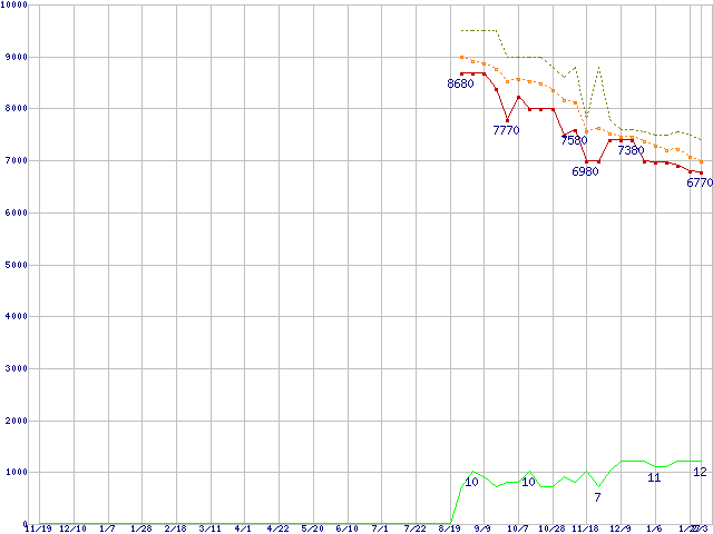 HD204UI (2TB,32MB)の価格推移↑前グラフ↓次グラフ(2009年11月19日〜2011年2月3日)※このグラフは過去のデータも税率5%相当に調整した税込み相当額のグラフです。●関連グラフHDD/SSD主要製品の最安値推移HDD/SSD主要製品(最安値1万円未満)の最安値推移HDD 2TB〜2.5TB未満の最安値推移EcoGreent F4 (5400rpm,3Gb/s,3.5インチ)の最安値推移●凡例最安値(点線部は販売店未確認または未調査)平均値最高値ショップ数