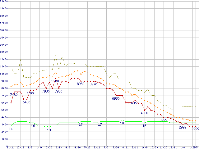 PC3-10600 2GB×2枚組みセットの価格推移↑前グラフ↓次グラフ(2009年11月21日〜2011年2月5日)※このグラフは過去のデータも税率5%相当に調整した税込み相当額のグラフです。●関連グラフメモリ主要製品の最安値推移4GBモジュール/2GBモジュール×2枚の最安値推移メモリ主要製品(最安値5千円未満)の最安値推移PC3-10600(DDR3-1333) DDR3 SDRAM DIMMの最安値推移●凡例最安値(点線部は販売店未確認または未調査)平均値最高値ショップ数