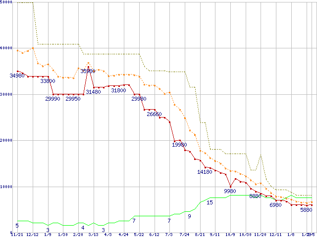 PC3-10600 4GB×2枚組みセットの価格推移↑前グラフ↓次グラフ(2009年11月21日〜2011年2月5日)※このグラフは過去のデータも税率5%相当に調整した税込み相当額のグラフです。●関連グラフメモリ主要製品の最安値推移メモリ主要製品(最安値5千円〜1万円未満)の最安値推移PC3-10600(DDR3-1333) DDR3 SDRAM DIMMの最安値推移●凡例最安値(点線部は販売店未確認または未調査)平均値最高値ショップ数