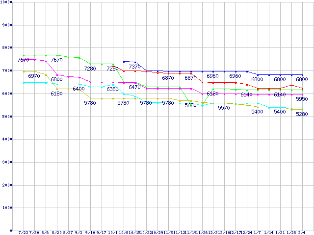 Socket AM3 (Dual Core)の最安値推移↑前グラフ↓次グラフ(2010年7月23日〜2011年2月4日)※このグラフは過去のデータも税率5%相当に調整した税込み相当額のグラフです。凡例Athlon II X2 250e (3.0GHz,L2 1MB×2,TDP 45W)Athlon II X2 265 (3.3GHz,L2 1MB×2,TDP 65W)Athlon II X2 245e (2.9GHz,L2 1MB×2,TDP 45W)Athlon II X2 260 (3.2GHz,L2 1MB×2,TDP 65W)Athlon II X2 240e (2.8GHz,L2 1MB×2,TDP 45W)Athlon II X2 255 (3.1GHz,L2 1MB×2,TDP 65W)※製品名をクリックすると個別のグラフを表示します※点線部は販売店が確認できなかった、または調査データがないことを示します