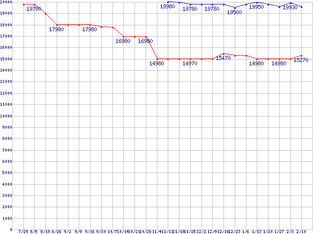 | HDD/SSD主要製品(最安値1万5千円〜2万円未満)の最安値推移 |