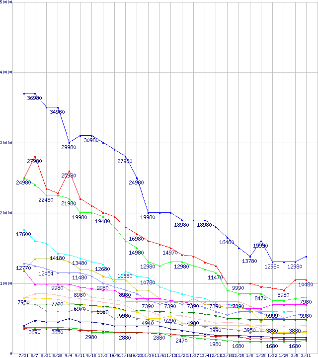 メモリ主要製品の最安値推移↑前グラフ↓次グラフ(2010年7月31日〜2011年2月11日)※このグラフは過去のデータも税率5%相当に調整した税込み相当額のグラフです。凡例PC3-12800 4GB×3枚組みセットPC3-10600 4GB×3枚組みセットPC3-12800 4GB×2枚組みセットPC2-6400 4GBPC3-10600 4GB×2枚組みセットPC3-12800 2GB×3枚組みセットPC3-10600 2GB×3枚組みセットPC3-12800 4GBPC2-6400 2GB×2枚組みセットPC3-12800 2GB×2枚組みセットPC3-10600 2GB×2枚組みセットPC3-10600 4GBPC3-12800 2GBPC2-6400 2GBPC3-10600 2GB※製品名をクリックすると個別のグラフを表示します※点線部は販売店が確認できなかった、または調査データがないことを示します