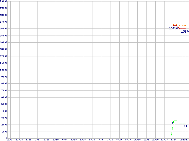 Core i5-2300 (2.80GHz,TDP 95W)の価格推移↑前グラフ↓次グラフ(2009年11月27日〜2011年2月11日)※このグラフは過去のデータも税率5%相当に調整した税込み相当額のグラフです。●関連グラフCPU主要製品の最安値推移CPU主要製品(最安値1万円〜2万円未満)の最安値推移Intel系CPUの最安値推移LGA1155 (Smart Cache 6MB,Quad Core,GPU内蔵)の最安値推移●凡例最安値(点線部は販売店未確認または未調査)平均値最高値ショップ数