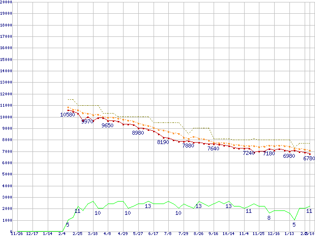 WD1002FAEX (1TB,64MB)の価格推移↑前グラフ↓次グラフ(2009年11月26日〜2011年2月10日)※このグラフは過去のデータも税率5%相当に調整した税込み相当額のグラフです。●関連グラフHDD/SSD主要製品の最安値推移HDD/SSD主要製品(最安値1万円未満)の最安値推移HDD 1TB〜1.5TB未満の最安値推移WD Caviar Black (7200rpm,6Gb/s)の最安値推移●凡例最安値(点線部は販売店未確認または未調査)平均値最高値ショップ数