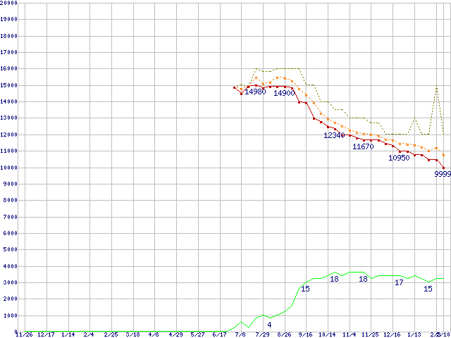 CTFDDAC064MAG-1G1 (64GB,MLC)の価格推移↑前グラフ↓次グラフ(2009年11月26日〜2011年2月10日)※このグラフは過去のデータも税率5%相当に調整した税込み相当額のグラフです。●関連グラフHDD/SSD主要製品の最安値推移HDD/SSD 60GB〜80GB未満の最安値推移RealSSD C300 (SSD,6Gbps,2.5インチ,リード355MB/s・ライト215〜70MB/s)の最安値推移●凡例最安値(点線部は販売店未確認または未調査)平均値最高値ショップ数