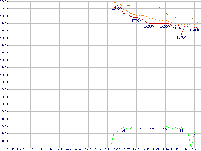 Core i5-760 (2.8GHz)の価格推移↑前グラフ↓次グラフ(2009年11月27日〜2011年2月11日)※このグラフは過去のデータも税率5%相当に調整した税込み相当額のグラフです。●関連グラフCPU主要製品の最安値推移CPU主要製品(最安値1万円〜2万円未満)の最安値推移Intel系CPUの最安値推移LGA1156 (L3キャッシュ8MB,Quad Core,TDP 82〜95W)の最安値推移●凡例最安値(点線部は販売店未確認または未調査)平均値最高値ショップ数