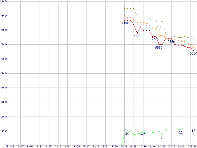 HD204UI (2TB,32MB)の価格推移↑前グラフ↓次グラフ(2009年11月26日〜2011年2月10日)※このグラフは過去のデータも税率5%相当に調整した税込み相当額のグラフです。●関連グラフHDD/SSD主要製品の最安値推移HDD/SSD主要製品(最安値1万円未満)の最安値推移HDD 2TB〜2.5TB未満の最安値推移EcoGreent F4 (5400rpm,3Gb/s,3.5インチ)の最安値推移●凡例最安値(点線部は販売店未確認または未調査)平均値最高値ショップ数