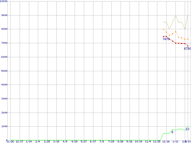 0S03085 (750GB,8MB)の価格推移↑前グラフ↓次グラフ(2009年11月26日〜2011年2月10日)※このグラフは過去のデータも税率5%相当に調整した税込み相当額のグラフです。●関連グラフHDD/SSD主要製品の最安値推移HDD/SSD主要製品(最安値1万円未満)の最安値推移HDD 750GB〜1TB未満の最安値推移TRAVELSTAR (5400rpm,3Gb/s,2.5インチ)の最安値推移●凡例最安値(点線部は販売店未確認または未調査)平均値最高値ショップ数