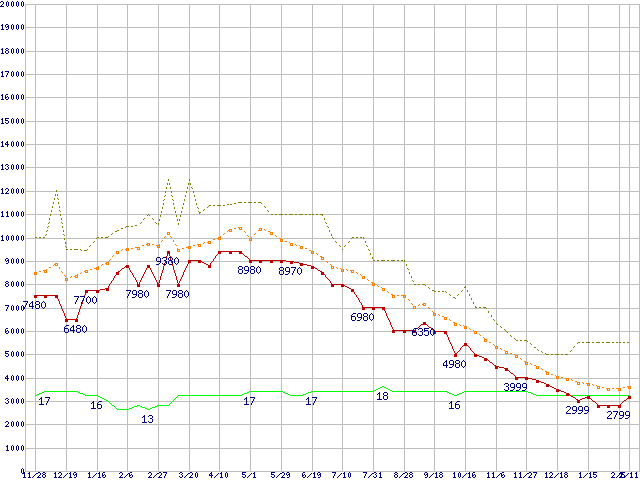 PC3-10600 2GB×2枚組みセットの価格推移↑前グラフ↓次グラフ(2009年11月28日〜2011年2月11日)※このグラフは過去のデータも税率5%相当に調整した税込み相当額のグラフです。●関連グラフメモリ主要製品の最安値推移4GBモジュール/2GBモジュール×2枚の最安値推移メモリ主要製品(最安値5千円未満)の最安値推移PC3-10600(DDR3-1333) DDR3 SDRAM DIMMの最安値推移●凡例最安値(点線部は販売店未確認または未調査)平均値最高値ショップ数